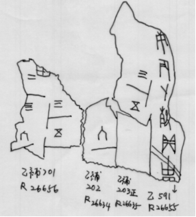 補充:第671例的乙629及乙633原ZR26692為遙綴,蔡哲茂先生驗證實物時找到實綴的接點,綴合位置如附圖。