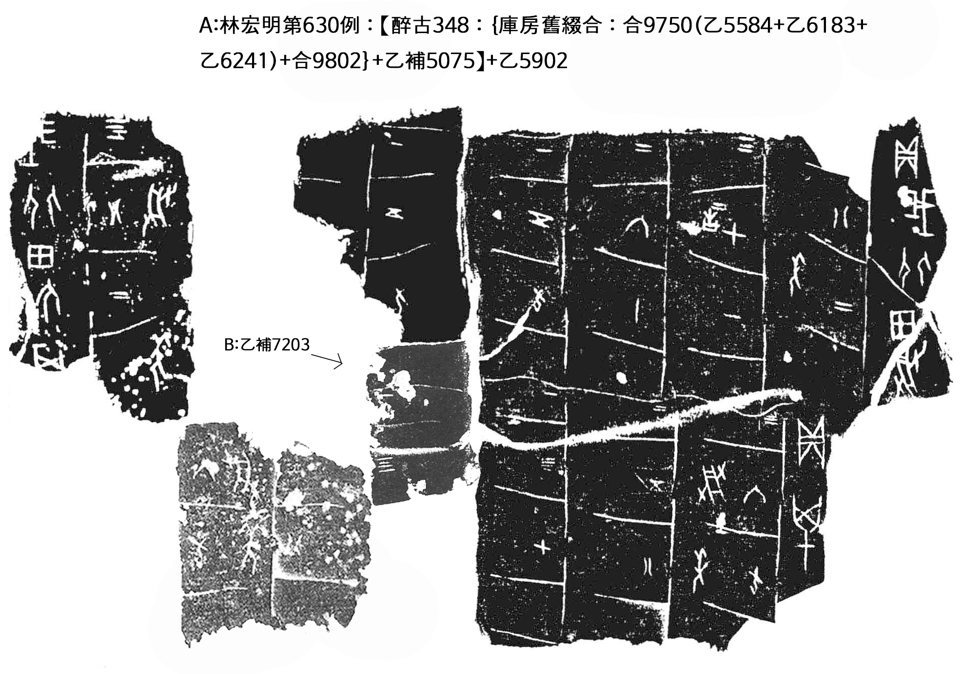 首页 / 甲骨学 / 甲骨缀合 / 甲骨試綴第1則【成知奐】甲骨試綴第1則【成知奐】 编辑:muztach 2024-01-132024-01-13 甲骨試綴第1則 成知奐 政大中文系碩士生 第1則: A:林宏明第630例:【醉古348:{庫房舊綴合:合9750(乙5584+乙6183+乙6241)+合9802}+乙補5075】+乙5902 B:乙補7203 A為林宏明師第630例[1],今於其左側加綴乙補7203。以千里路為基準左右盾紋、兆序符合,且經實物驗證反面齒縫咬合。 (綴合得到林宏明師的指導與師長同學鼓勵,謹致謝忱。) 林宏明:《甲骨新綴第630-633例》 ,網址:https://www.xianqin.org/blog/archives/6253.html ↑