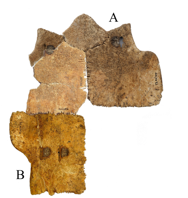 A與B版綴合後,折口密合,盾紋接續,符合邊甲形態。