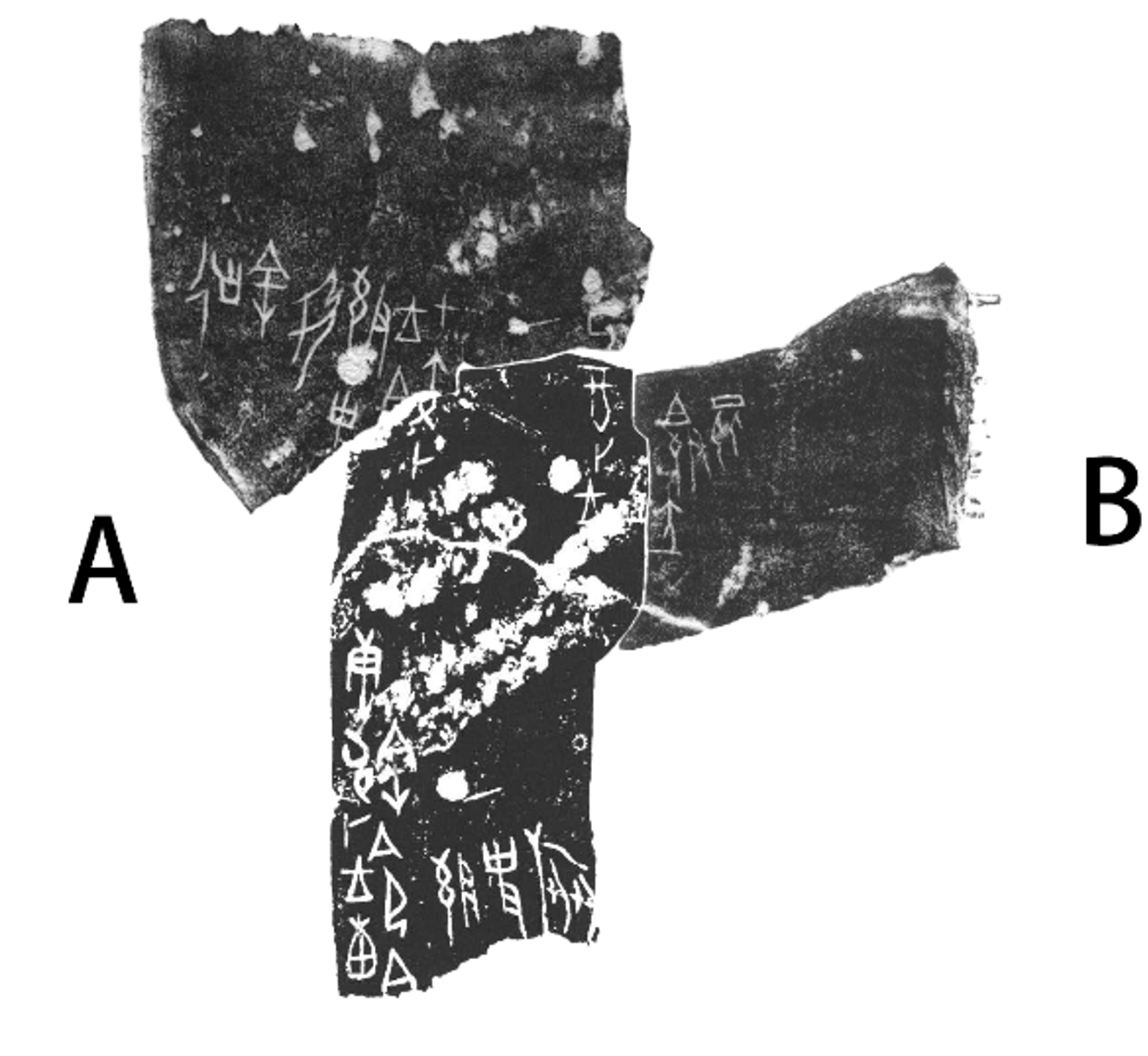 说明:A部分为蔡哲茂先生和宋镇豪先生缀合。现尝试在A右侧加缀B,二者盾纹相连,茬口密合。根据黄天树先生的《殷墟王卜辞的分类与断代》,A部分主要字体为师肥笔类,但“右上‘己酉卜王’一辞字体是𠂤组小字类”。(参考2007年版p28页下注)加缀的B版也是师小字,字体相符,内容也均与伯 有关。伯