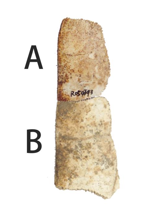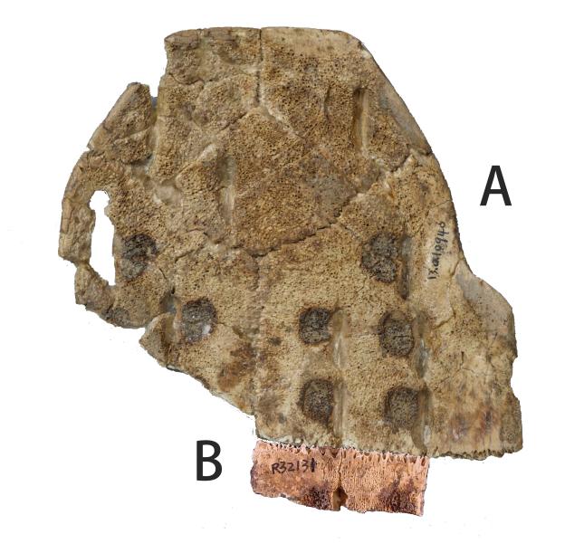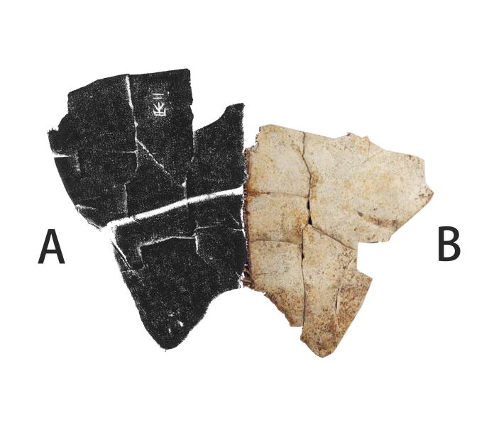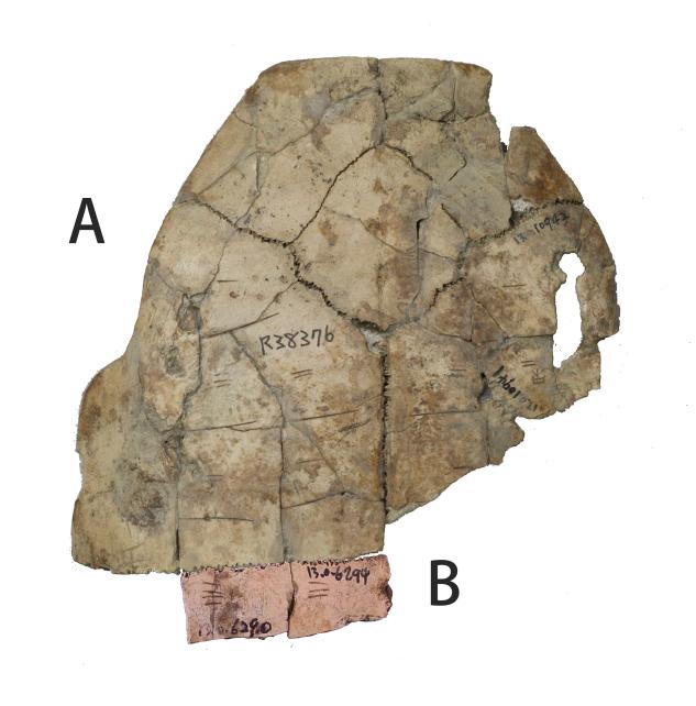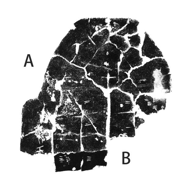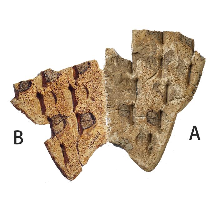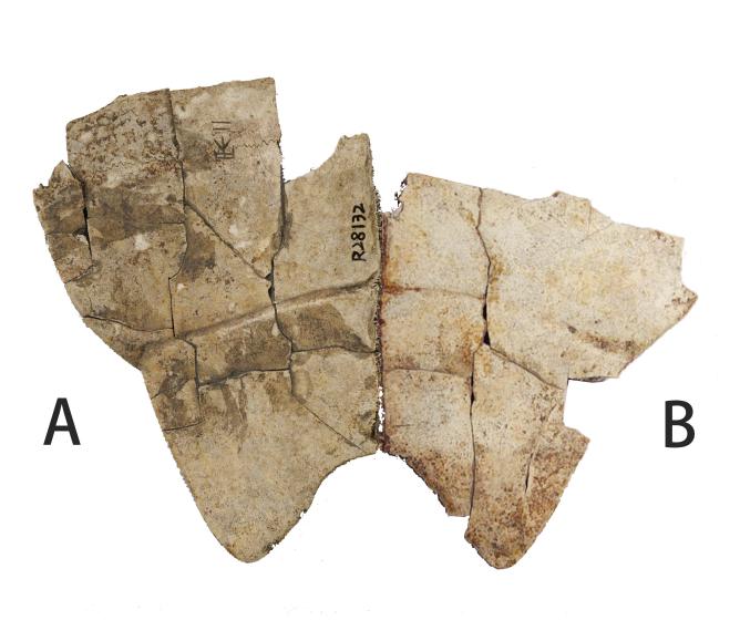 A與B綴合後,齒縫咬合,盾紋接續,符合腹甲形態。