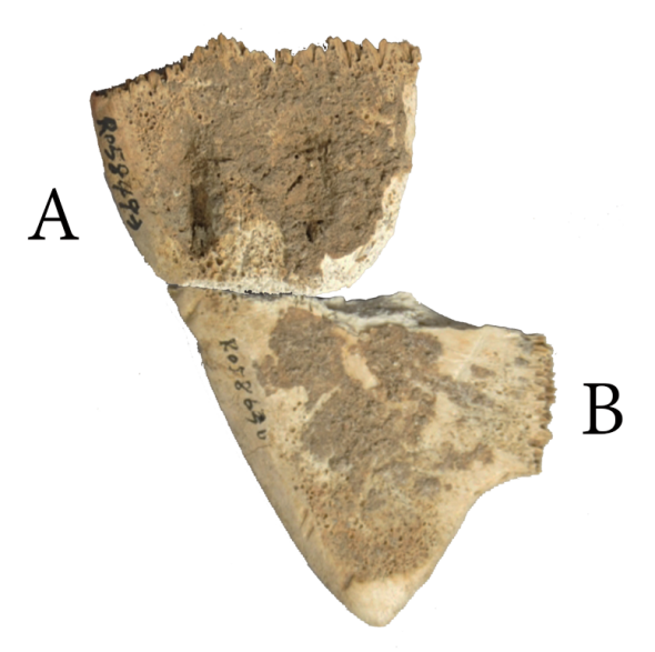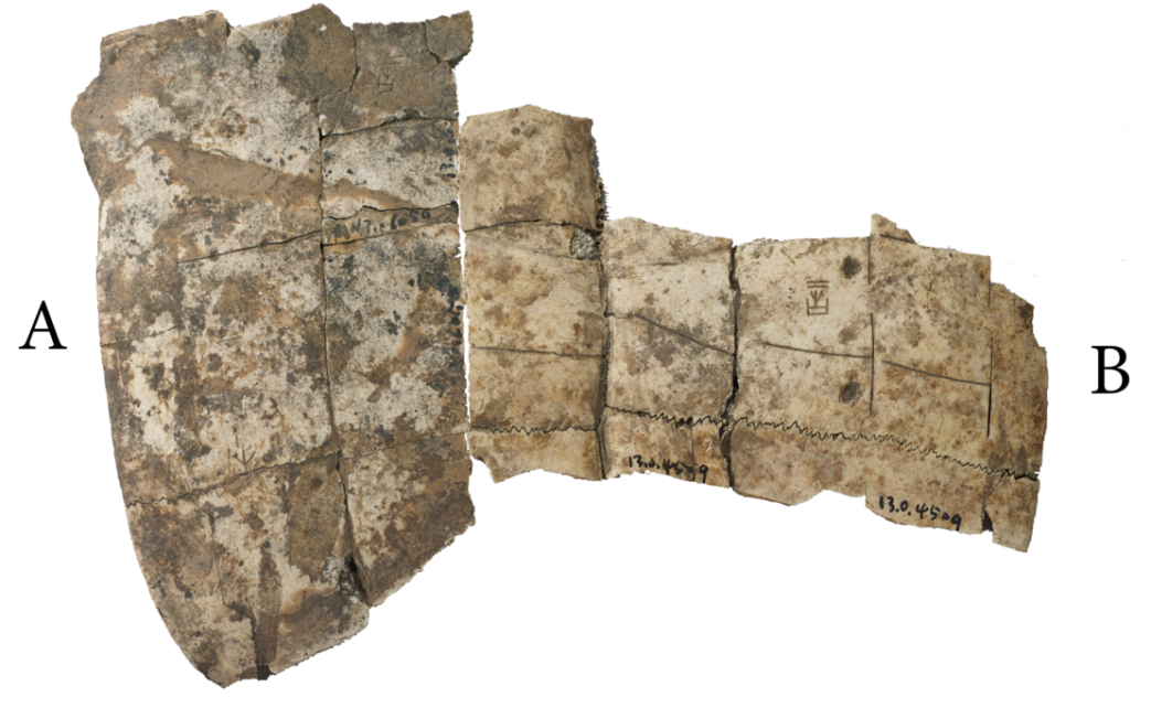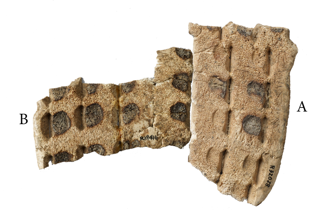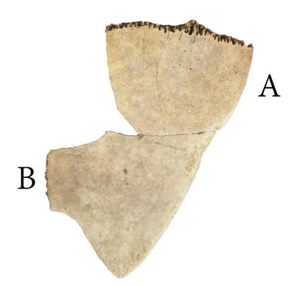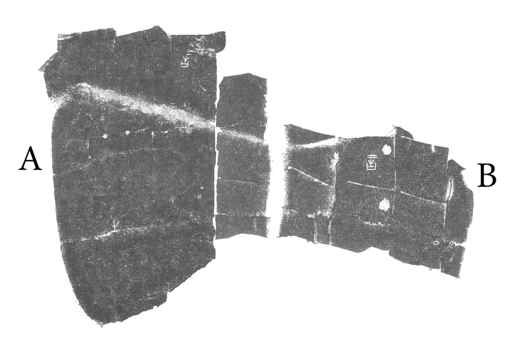 A與B版綴合後,折口密合,復原局部鑽鑿,盾紋、齒縫接續,符合腹甲形態。