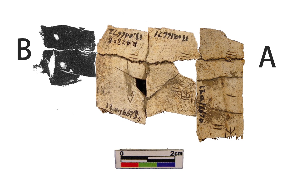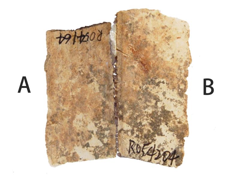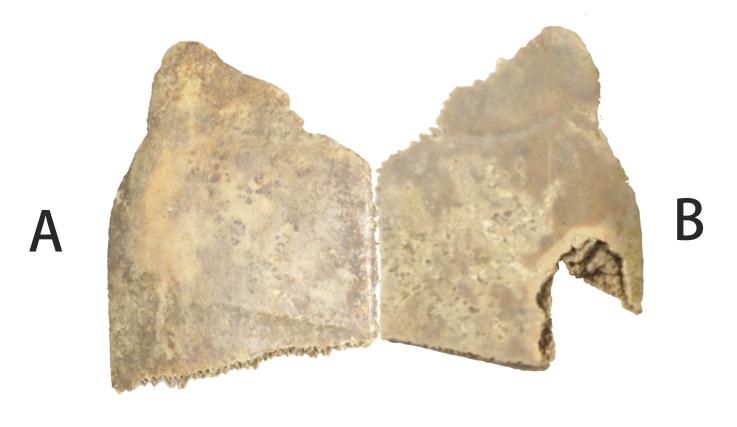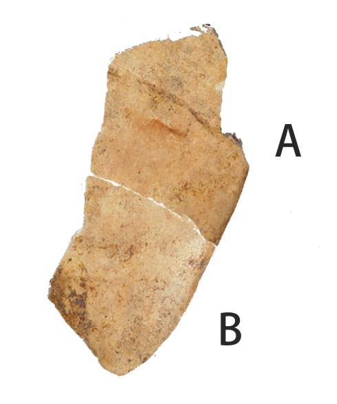 A版綴合情況參見姚鎔燁甲骨拼綴第55則,[1]今筆者加綴B(R054433)。綴合後,折口密合,符合尾甲形態。