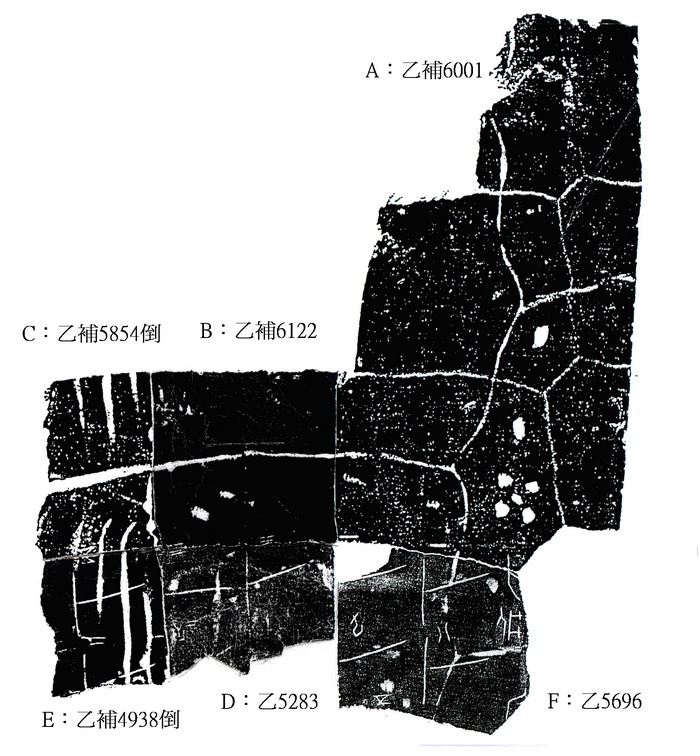 A:乙補6001 B:乙補6122 C:乙補5854倒 D:乙5283 E:乙補4938倒 F:乙5696(合13805) 【A+B+C】為林宏明先生綴合,[1]【D+E】為林勝祥先生綴合,[2]筆者曾將【A+B+C】和【C+D】綴上。[3]今加綴F一版。